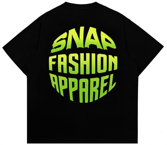 ELEVATE YOUR FASHION GAME WITH THIS HIGH-END LUXURY SNAP NEON ENERGY TEE. THIS BLACK T-SHIRT FEATURES A BOLD “SNAP FASHION APPAREL” LOGO ON THE BACK, DESIGNED IN A STRIKING LEMON GREEN TO DARK GREEN GRADIENT THAT RADIATES ENERGY AND ATTITUDE. MADE WITH SOFT, 320 GSM MATERIAL AND BREATHABLE COTTON, IT COMBINES COMFORT WITH AN EDGY AESTHETIC. PERFECT FOR CASUAL OUTINGS OR MAKING A STATEMENT, THIS TEE EMBODIES CONFIDENCE AND STYLE.